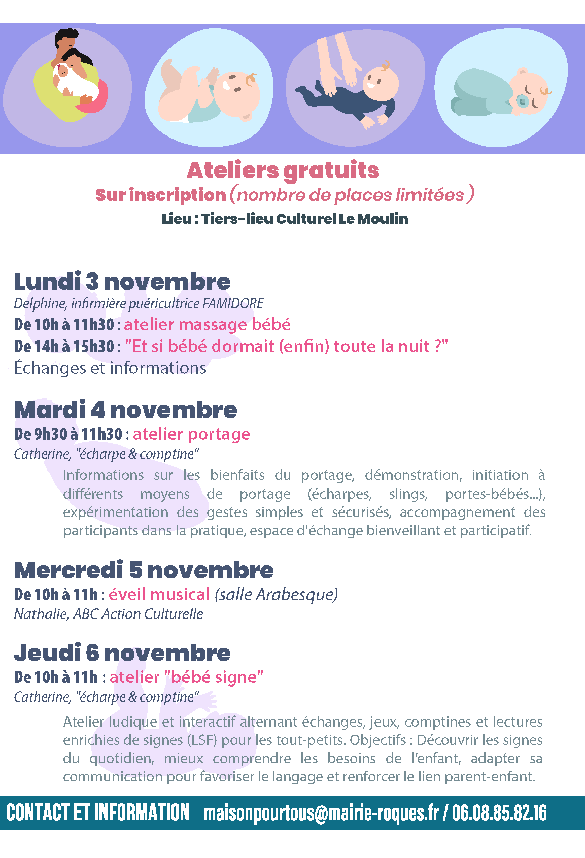 Au programme, chaque jour une parenthèse de bien-être avec des professionnels pour se ressourcer, échanger, apprendre et évoluer en toute sérénité avec son tout-petit.