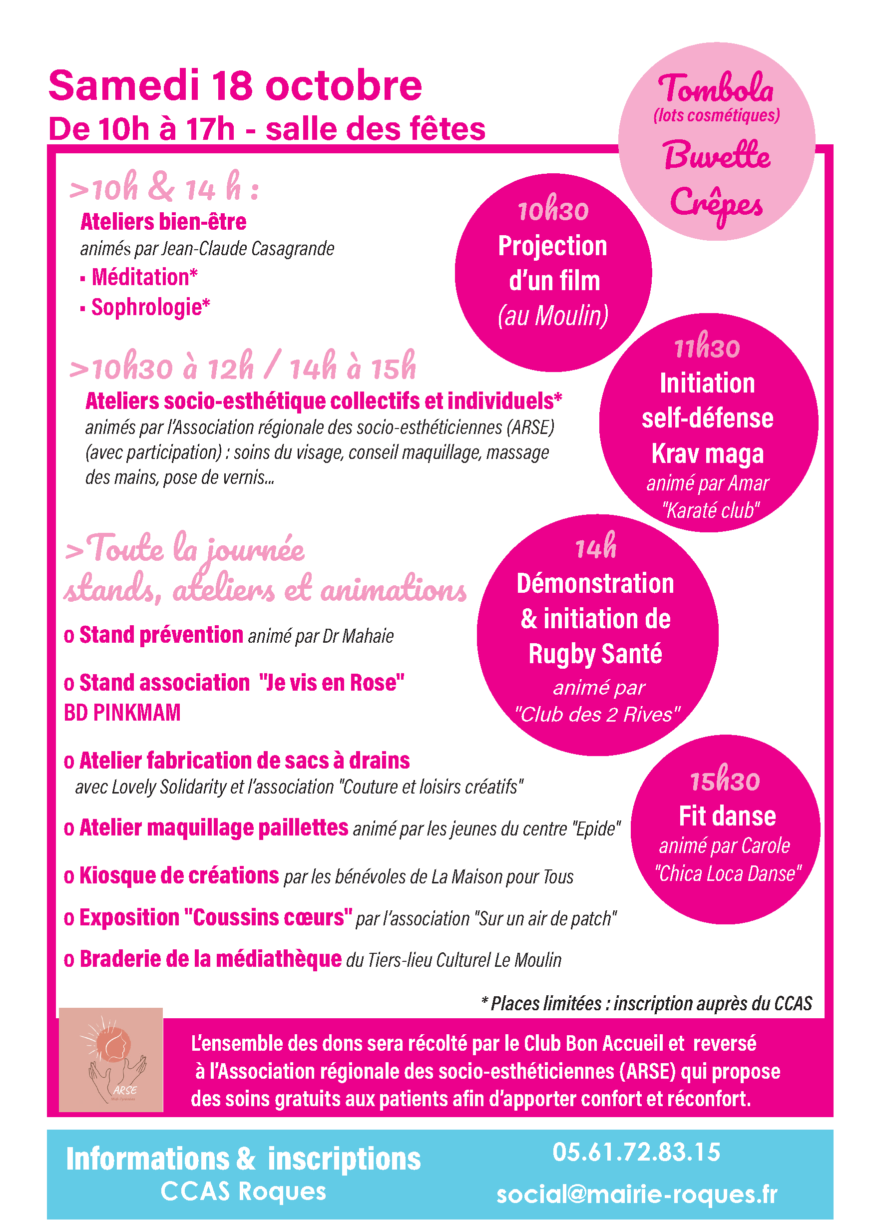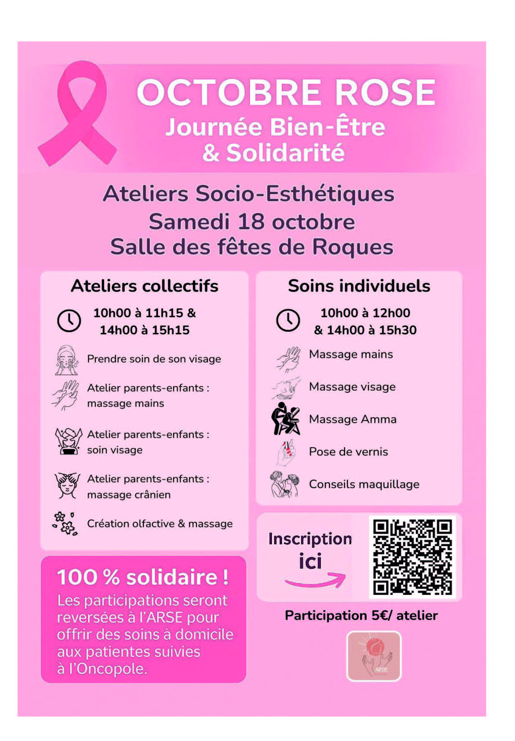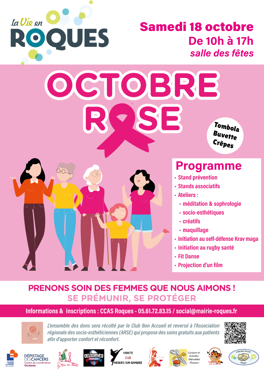 Chaque année, le CCAS de Roques s’engage pour soutenir la campagne Octobre Rose, dédiée à la lutte contre le cancer du sein, en proposant des actions de sensibilisation, de prévention et de soutien