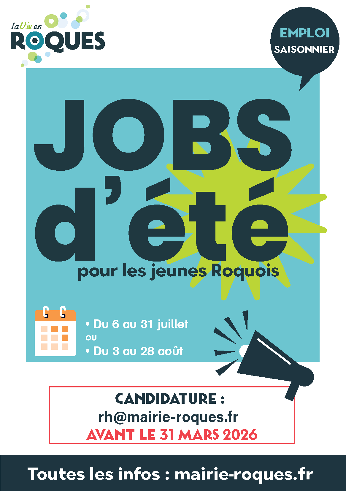 - par voie postale : Monsieur le Maire, Place Jean Jaurès, 31120 ROQUES.
