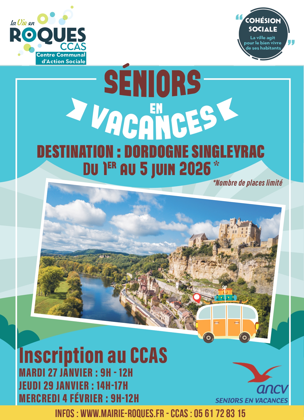 Le CCAS de Roques prépare le prochain voyage annuel destiné aux roquois et roquoises de plus de 65 ans. Le séjour aura lieu du lundi 1er au vendredi 5 juin 2026 en Dordogne dans le village de Singleyrac.