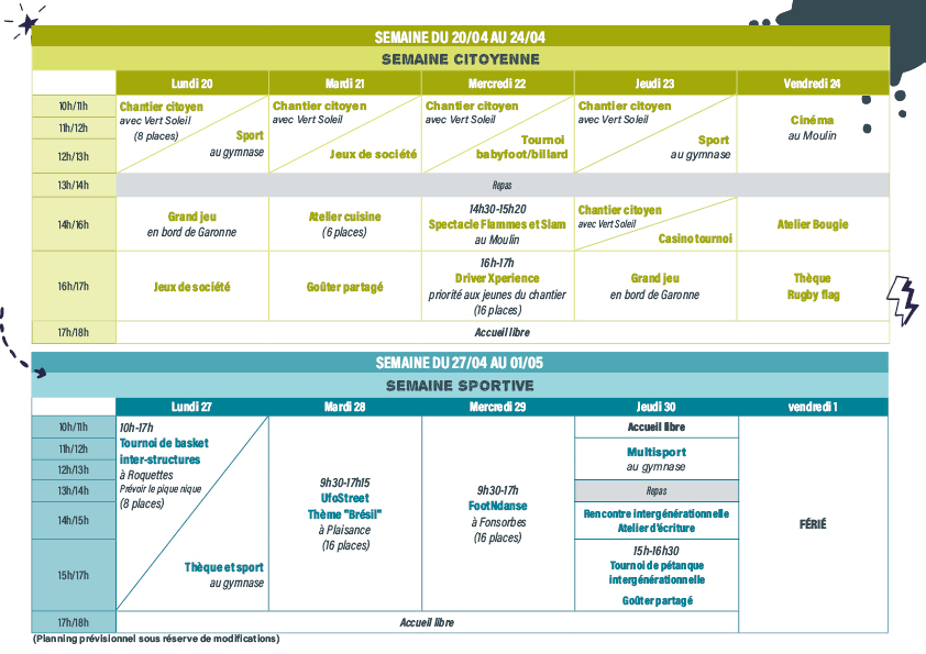 Chantier citoyen avec l’association Vert Soleil, sport, jeux de société, spectacle, atelier cuisine, cinéma…